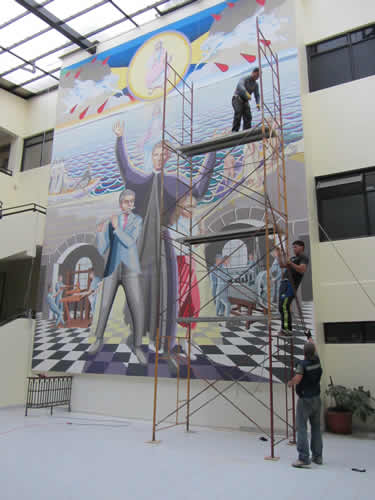 Germán Villalobos pintando una sección del mural Don Bosco