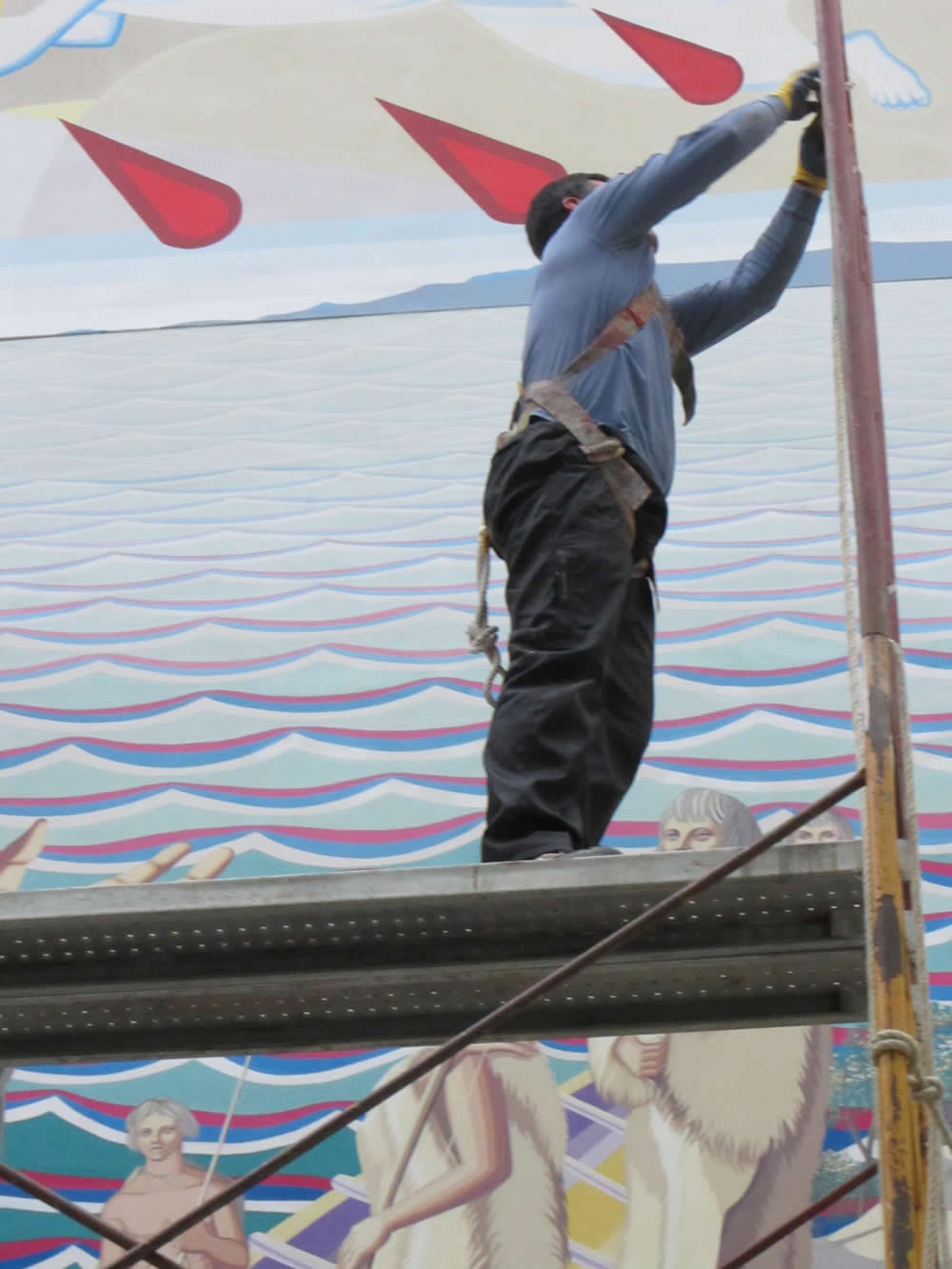 Germán Villalobos pintando una sección del mural Don Bosco